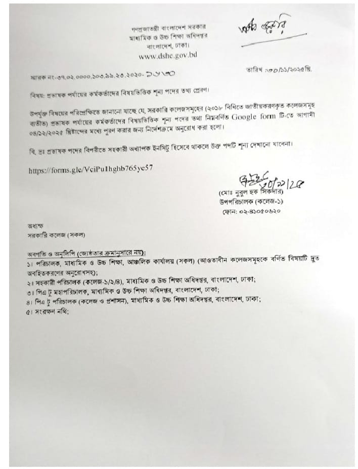 বিজ্ঞপ্তিতে বলা হয়েছে, সরকারি কলেজসমূহের (২০১৮ বিধিতে জাতীয়করণকৃত কলেজসমূহ ব্যতীত) প্রভাষক পর্যায়ের কর্মকর্তাদের বিষয়ভিত্তিক শূন্য পদের তথ্য (https://forms.gle/VciPulhghb765 ye57) গুগল ফরমে আগামী ৪ ডিসেম্বরের মধ্যে পূরণ করার জন্য নির্দেশক্রমে অনুরোধ করা হলো।