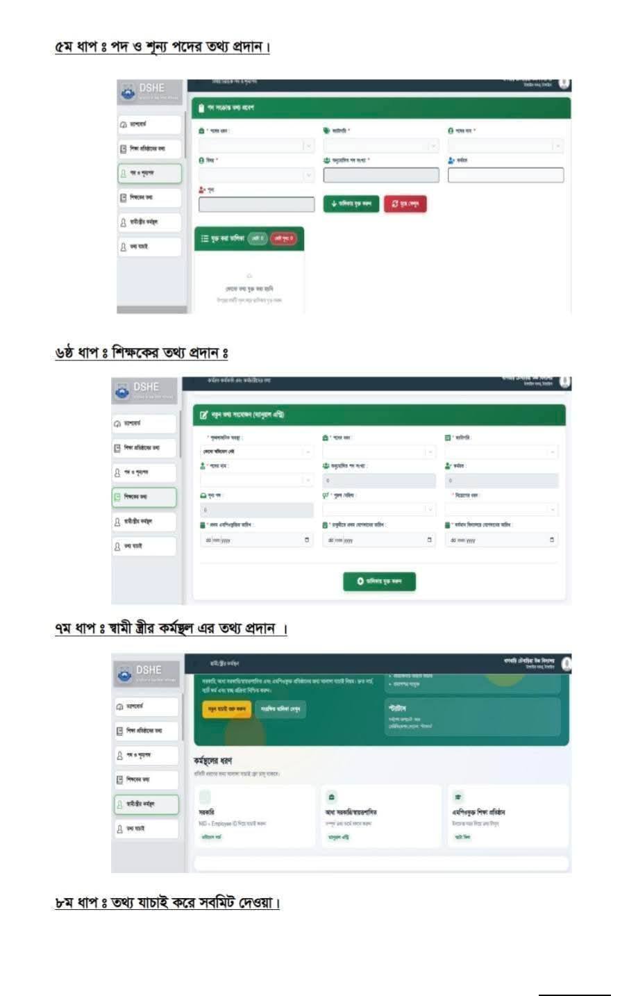 ৫ম ধাপে পদ ও শূন্য পদের তথ্য দিতে হবে। ৬ষ্ঠ ধাপে শিক্ষকদের তথ্য দিতে হবে। সপ্তম ধাপে স্বামী-স্ত্রীর কর্মস্থলের তথ্য দিতে হবে। ৮ম ধাপে তথ্য যাচাই করে সাবমিট করতে হবে।