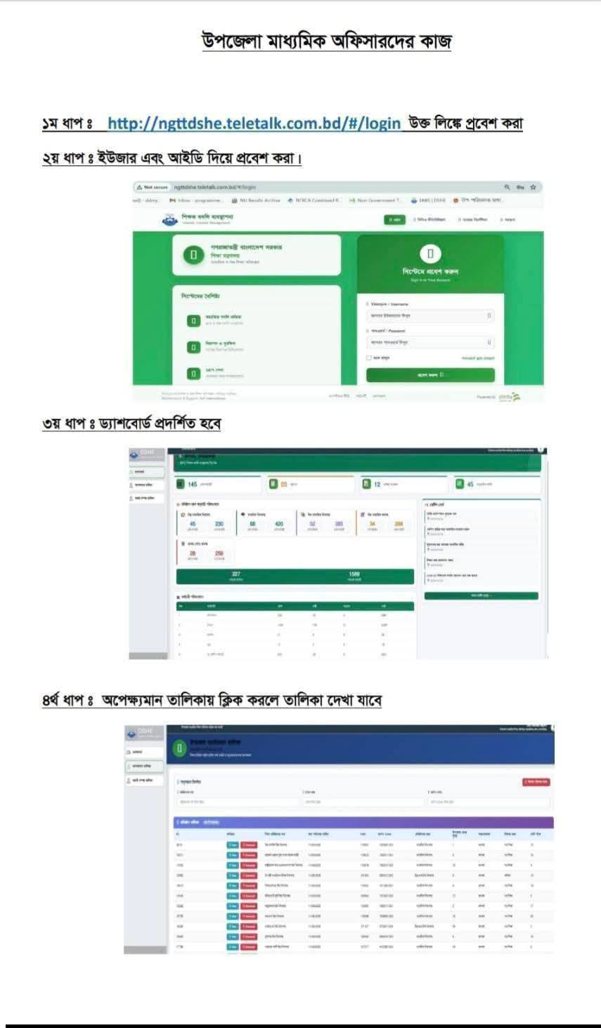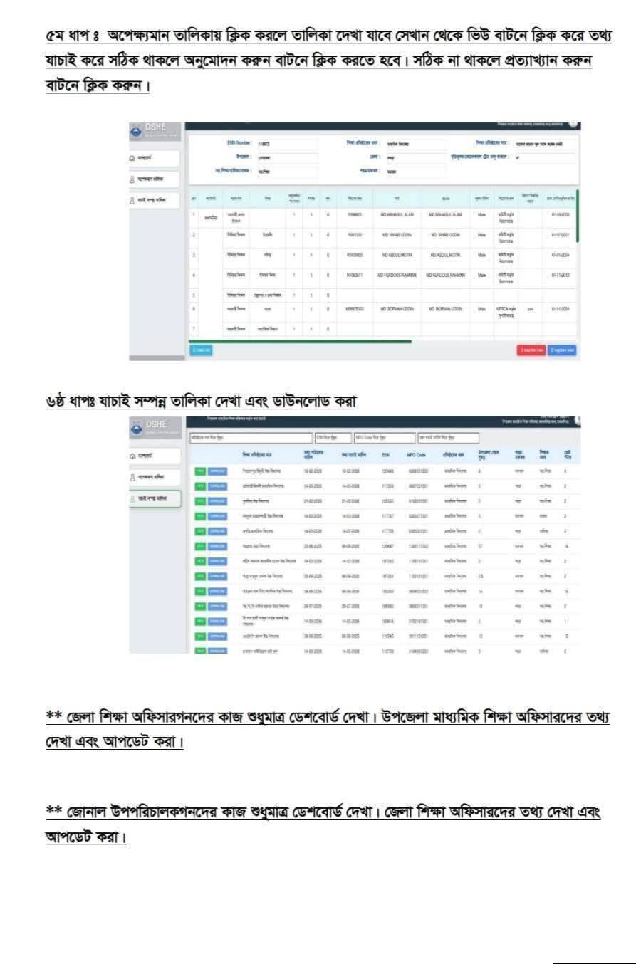 প্রতিষ্ঠানপ্রধানের তথ্য দেওয়ার পর উপজেলা মাধ্যমিক শিক্ষা অফিসারের কার্যক্রম শুরু হবে। উপজেলা শিক্ষা অফিসারকেও একইভাবে প্রথম ধাপে লিংকে প্রবেশ করতে হবে। দ্বিতীয় ধাপে ইউজার আইডি ও পাসওয়ার্ড ব্যবহার করে লগ-ইন করতে হবে। তৃতীয় ধাপে ড্যাশবোর্ড প্রদর্শিত হবে। চতুর্থ ধাপে প্রতিষ্ঠানপ্রধানদের দেওয়া তথ্য অপেক্ষমান তালিকায় দেখাবে। অপেক্ষমান তালিকায় ক্লিক করতে হবে।