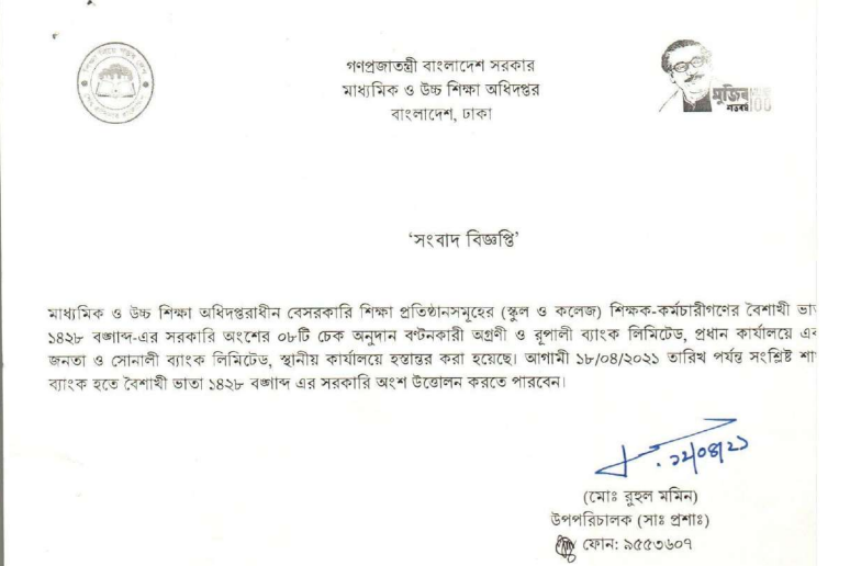 স্কুল-কলেজের শিক্ষকদের বৈশাখী ভাতার চেক ছাড়