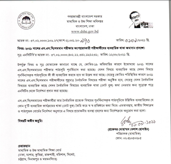 মাউশি পরিচালক (মাধ্যমিক) প্রফেসর বেলাল হোসাইন স্বাক্ষরিত নির্দেশনায় বলা হয়েছে, এসএসসি ও সমমান পরীক্ষার্থীদের নৈর্বাচনিক প্রত্যেক বিষয়ের পুনর্বিন্যাস করা পাঠ্যসূচির ব্যবহারিকের যেকোনও দুটি ব্যবহারিক কার্যক্রমের খাতা (নোট বুক) তৈরি করে নিজ নিজ প্রতিষ্ঠানে জমা দেবে।