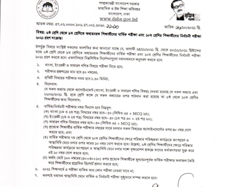 নির্দেশনা বলা হয়েছে, আগামী ২৪ নভেম্বর থেকে ৩০ নভেম্বরে মধ্যে সব স্কুলের বার্ষিক পরীক্ষা ও ১০ শ্রেণির শিক্ষার্থী শিক্ষার্থীদের নির্বাচনী পরীক্ষা শেষ করতে হবে। সব স্কুল কলেজেকে ২৪ নভেম্বর থেকে ৩০ নভেম্বরের মধ্যে বাংলা, ইংরেজি ও গণিত বিষয়ে বার্ষিক পরীক্ষা নিতে হবে।