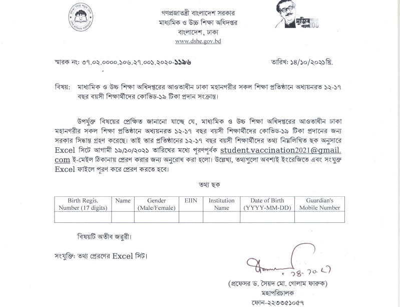 বিজ্ঞপ্তিতে বলা হয়েছে, মাধ্যমিক ও উচ্চশিক্ষা প্রতিষ্ঠানের আওতাধীন ঢাকা মহানগরীর সকল স্কুল-কলেজে অধ্যয়নরত ১২-১৭ বছর বয়সী শিক্ষার্থীদের কোভিড-১৯ এর টিকা দেওয়ার সিদ্ধান্ত নিয়েছে সরকার। তাই নিজ নিজ প্রতিষ্ঠানের ১২-১৭ বছর বয়সী শিক্ষার্থীদের তথ্য নির্ধারিত ছক অনুসারে এক্সেল শিটে আগামী ১৯ অক্টোবরের মধ্যে পূরণ করে ইমেইল (student.vaccination2021@gmail.com) ঠিকানায় প্রেরণ করতে অনুরোধ করা হলো।
