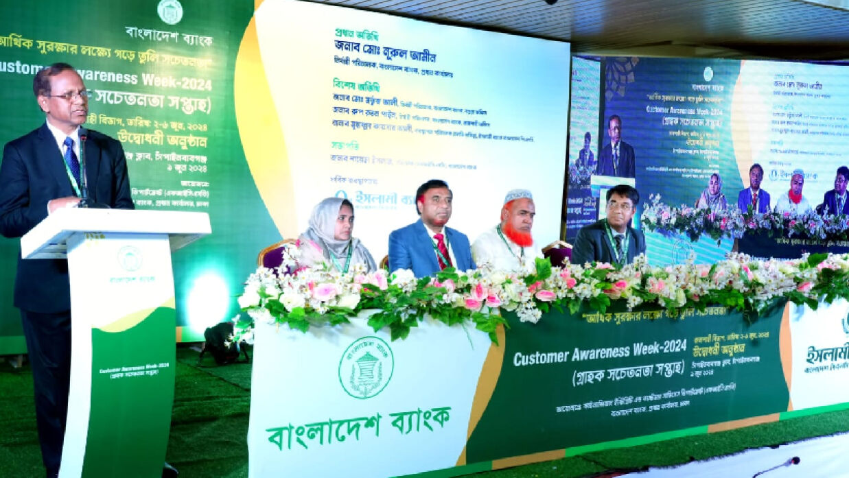 বাংলাদেশ ব্যাংকের ফাইন্যান্সিয়াল ইন্টিগ্রিটি অ্যান্ড কাস্টমার সার্ভিসেস ডিপার্টমেন্ট (এফআইসিএসডি)-এর উদ্যোগে এবং ইসলামী ব্যাংক বাংলাদেশ পিএলসির সার্বিক ব্যবস্থাপনায় শনিবার (১ জুন) চাঁপাইনবাবগঞ্জ জেলায় আর্থিক সুরক্ষা বিষয়ে সচেতনতা তৈরির লক্ষ্যে রাজশাহী বিভাগের গ্রাহক সচেতনতা সপ্তাহ-২০২৪ এর উদ্বোধন করা হয়েছে। চাঁপাইনবাবগঞ্জ ক্লাবে অনুষ্ঠিত উক্ত অনুষ্ঠানে প্রধান অতিথি হিসেবে উপস্থিত ছিলেন বাংলাদেশ ব্যাংক প্রধান কার্যালয়ের নির্বাহী পরিচালক মো. নূরুল আমীন। বিশেষ অতিথি হিসেবে বক্তব্য দেন বাংলাদেশ ব্যাংক বগুড়া অফিসের নির্বাহী পরিচালক মো. মর্তুজ আলী, বাংলাদেশ ব্যাংক রাজশাহী অফিসের নির্বাহী পরিচালক রুপ রতন পাইন এবং ইসলামী ব্যাংক বাংলাদেশ পিএলসির অতিরিক্ত ব্যবস্থাপনা পরিচালক মুহাম্মদ কায়সার আলী। অনুষ্ঠানে সভাপতিত্ব করেন বাংলাদেশ ব্যাংকের ফাইন্যান্সিয়াল ইন্টিগ্রিটি অ্যান্ড কাস্টমার সার্ভিসেস ডিপার্টমেন্ট (এফআইসিএসডি)-এর পরিচালক শায়েমা ইসলাম।