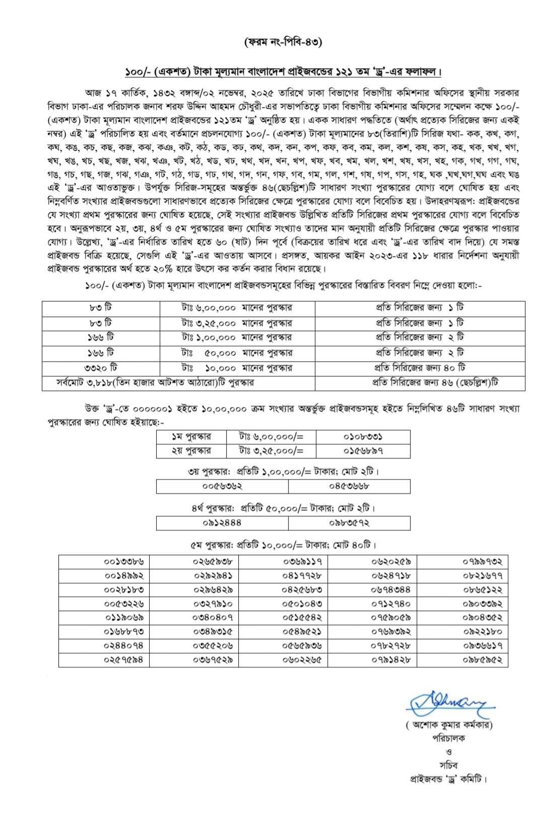 ১০০ টাকা মূল্যমানের প্রাইজবন্ডের ১২১তম ‘ড্র’ অনুষ্ঠিত হয়েছে। রবিবার (২ নভেম্বর) ঢাকা বিভাগের বিভাগীয় কমিশনার অফিসের স্থানীয় সরকার বিভাগ ঢাকার পরিচালক শরফ উদ্দিন আহমদ চৌধুরীর সভাপতিত্বে ঢাকা বিভাগীয় কমিশনার অফিসের সম্মেলন কক্ষে এ ‘ড্র’ অনুষ্ঠিত হয়। এতে প্রথম পুরস্কার হিসেবে ৬ লাখ টাকা পেয়েছে ০১০৮৩৩১ নম্বর; ৩ লাখ ২৫ হাজার টাকার দ্বিতীয় পুরস্কার জিতেছে ০১৫৬৮৯৭ নম্বর। এছাড়া তৃতীয় পুরস্কার ১ লাখ টাকা করে পেয়েছে ০০৫৬৩৬২ ও ০৪৫৩৬৬৮ নম্বর।