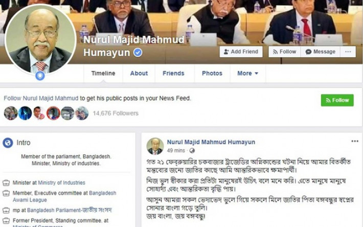 বৃহস্পতিবার রাতে মন্ত্রীর ভেরিফাইড ফেসবুক এ্যাকাউন্টে ওই বক্তব্যের জন্য ক্ষমা চেয়ে একটি পোস্ট দেখা যায়। তাতে লেখা ছিল, ‘গত ২১ ফেব্রুয়ারির চকবাজার ট্রাজেডির অগ্নিকাণ্ডের ঘটনা নিয়ে আমার বিতর্কিত মন্তব্যের জন্যে জাতির কাছে আমি আন্তরিকভাবে ক্ষমাপ্রার্থী।’