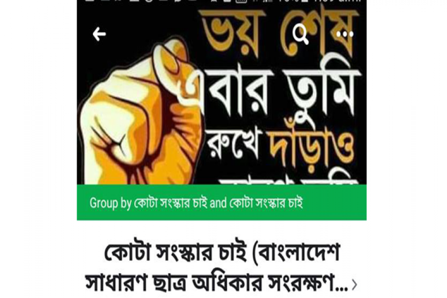সরকারি চাকরিতে কোটা সংস্কার আন্দোলনকে কেন্দ্র করে গড়ে উঠা বাংলাদেশ সাধারণ ছাত্র অধিকার সংরক্ষণ পরিষদের সর্ববৃহৎ প্লাটফর্ম ফেসবুক গ্রুপটি পার্মানেন্টলি ডিলিট করে দিয়েছে ফেসবুক কর্তৃপক্ষ। সোমবার রাতে এ গ্রুপটিতে আর ডুকা যাচ্ছেনা বলে জানা গেছে।