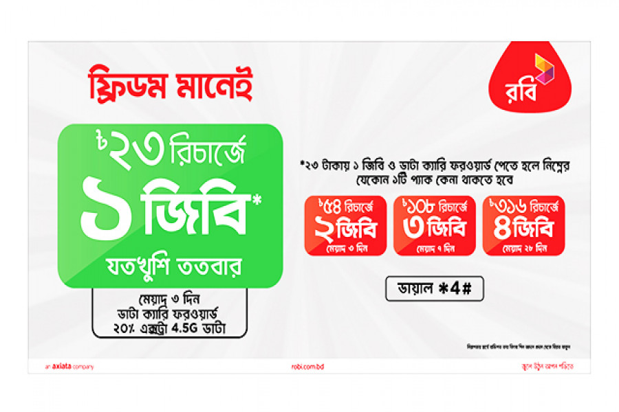 গ্রাহকরা যেন তাদের অব্যবহৃত ডেটা কাজে লাগাতে পারেন এজন্য ফ্রিডম প্যাক নামে একটি অনন্য অফার এনেছে দেশের শীর্ষ ডিজিটাল সেবা প্রদানকারী কোম্পানি রবি। ফ্রিডম প্যাকের আওতায় ২৩ টাকা প্যাক রিচার্জ করে অব্যবহৃত ডেটা কাজে লাগানোর এ সুযোগ পাবেন গ্রাহকরা।