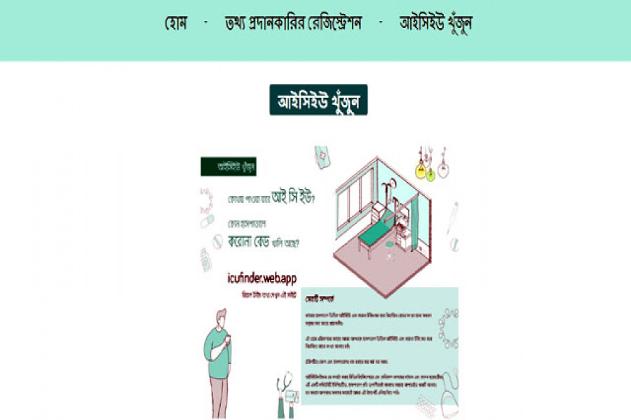 চলমনা করোনা সংকটে মুমুর্ষূ রোগীদের জন্য বিরাজ করছে নিবিড় পরিচর্যা কেন্দ্রে (আইসিইউ) এর প্রচণ্ড সংকট। আর স্থান সংকুলানজনিত সমস্যার কারণে কোভিড-১৯ আক্রান্ত রোগীরা অনেকেই হাসপাতালে ঘুরে ঘুরে চিকিৎসা পাচ্ছেন না। এ পরিস্থিতিতে এগিয়ে এসেছে ঢাকা বিশ্ববিদ্যালয়, বাংলাদেশ প্রকৌশল বিশ্ববিদ্যালয়, শাহজালাল বিজ্ঞান ও প্রযুক্তি বিশ্ববিদ্যালয় এবং দেশব্যাপী বিভিন্ন মেডিক্যাল কলেজের একদল স্বেচ্ছাসেবক। তারা তৈরি করেছে icufinder.web.app নামে একটি ওয়েবসাইট।