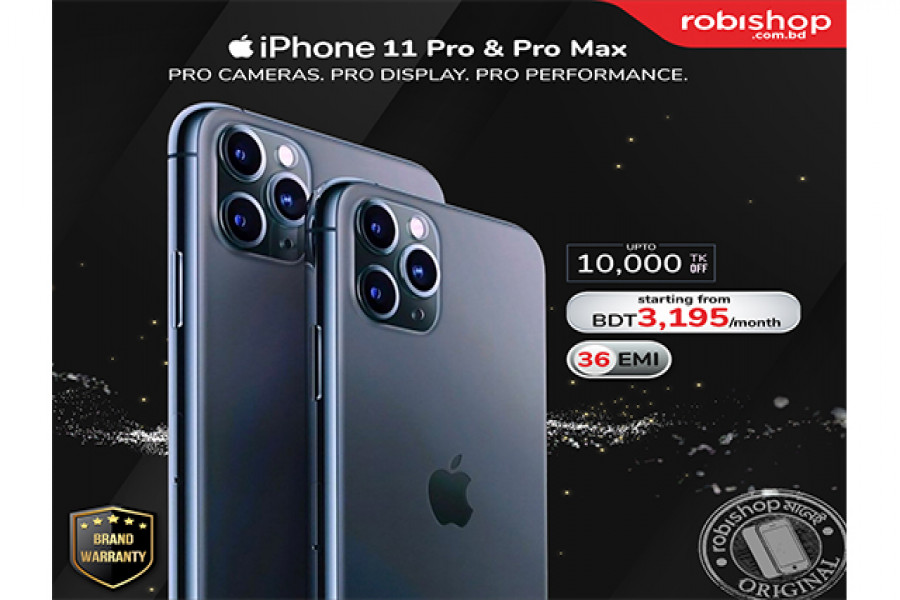 অ্যাপলের সর্বশেষ স্মার্টফোন মডেল আইফোন ১১ প্রো এবং ১১ প্রো ম্যাক্স কেনার ক্ষেত্রে ১০ হাজার টাকা পর্যন্ত ছাড় দিচ্ছে দেশের প্রিমিয়ার ই-কমার্স প্ল্যাটফর্ম রবিশপ ডটকম ডটবিডি। স্মার্টফোনগুলো কেনার ক্ষেত্রে রয়েছে মাসিক সর্বনিম্ন ৩ হাজার ৬১২ টাকার পেমেন্টসহ ৩৬ মাসের ইএমআই সুবিধা।