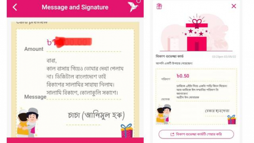 বিকাশের ব্যতিক্রমী এই গিফট ফিচারে গিফট পেয়ে মানুষ আবার শুভেচ্ছা কার্ড টি সামাজিক যোগাযোগ মাধ্যমে শেয়ার এর মাধ্যমে ঈদের আনন্দ ভাগাভাগি করে নিচ্ছে৷ বিকাশের সেন্ড মানি অপশনে গিয়ে খুব সহজেই ফিচারটি ব্যবহার করে ঈদ সালামি পাঠানো যাচ্ছে৷