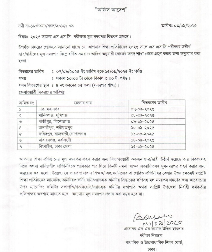 এতে বলা হয়, নির্ধারিত এই দিনগুলোতে প্রতিদিন সকাল ১০টা থেকে বিকেল ৩টা পর্যন্ত বোর্ডের ৪ নং ভবনের ৫ম তলায় অবস্থিত সনদ শাখা থেকে এই নম্বরপত্র বিতরণ করা হবে।