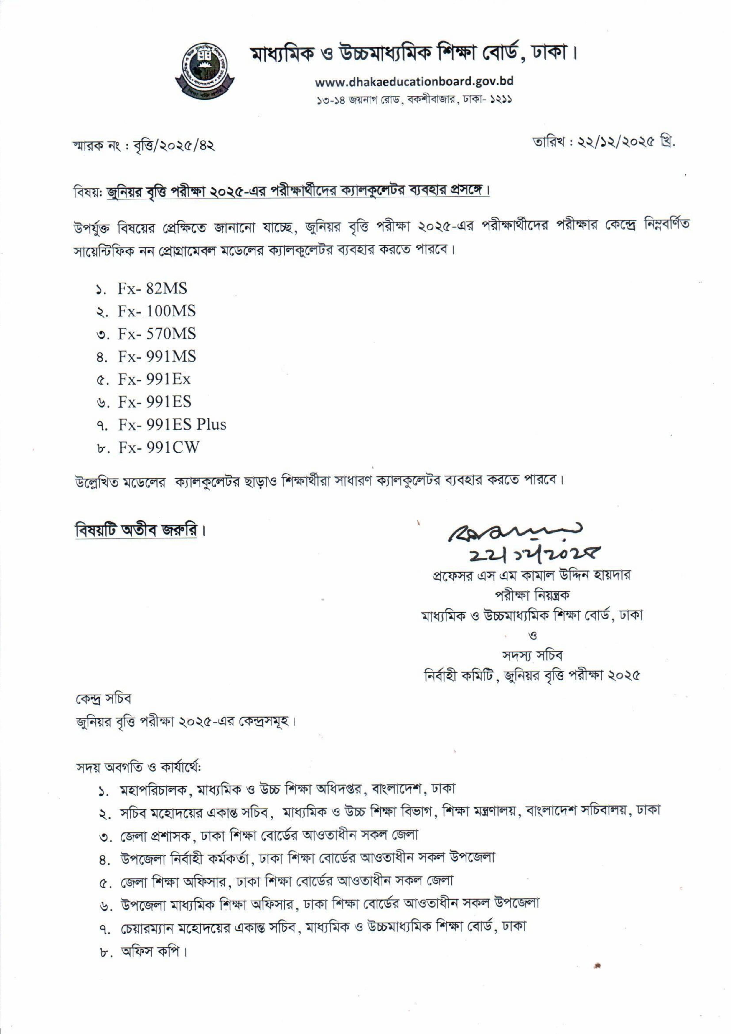 বিজ্ঞপ্তি অনুযায়ী, শিক্ষার্থীরা Fx-82MS, Fx-100MS, Fx-570MS, Fx-991MS, Fx-991Ex, Fx-991ES, Fx-991ES Plus এবং Fx-991CW মডেল ব্যবহার করতে পারবে। এ ছাড়াও সাধারণ (নন–সায়েন্টিফিক) ক্যালকুলেটর ব্যবহারের সুযোগ থাকবে।