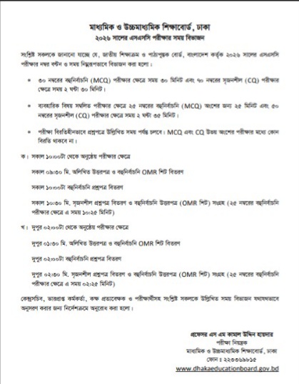 ২০২৬ সালের এসএসসি পরীক্ষার নম্বর বণ্টন ও সময় বিভাজন নির্ধারণ করে পরীক্ষা পরিচালনা সংক্রান্ত নীতিমালা প্রকাশ করেছে ঢাকা শিক্ষা বোর্ড। নীতিমালায় এসএসসি পরীক্ষায় সৃজনশীল ও বহুনির্বাচনি প্রশ্নপত্র একসঙ্গে দেওয়া হবে কি না—এ বিষয়ে স্পষ্ট নির্দেশনা দেওয়া হয়েছে।