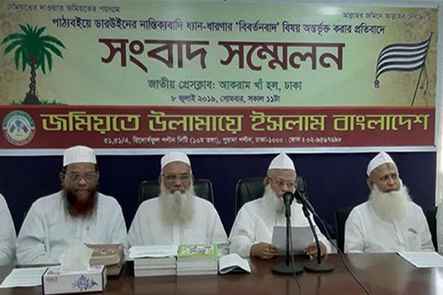 ২০১৩ খ্রিষ্টাব্দ থেকে নবম শ্রেণি থেকে মাস্টার্স পর্যন্ত পাঠ্যবইয়ে শিক্ষার আধুনিকায়নের নামে ‘বিবর্তনবাদ’ বিষয়টি অন্তর্ভুক্ত করার অভিযোগ এনে তা অবিলম্বে বাতিলের দাবি জানিয়েছে জমিয়তে উলামায়ে ইসলাম বাংলাদেশ। সোমবার (৮ জুলাই) জাতীয় প্রেসক্লাবের আকরাম খাঁ হলে এক সংবাদ সম্মেলনে দলটি পক্ষ থেকে এই দাবি জানানো হয়।
