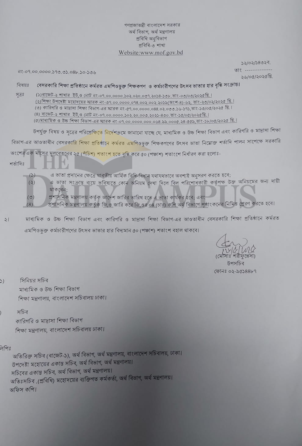সম্মতিপত্রে বলা হয়েছে, ‘মাধ্যমিক ও উচ্চশিক্ষা বিভাগ এবং কারিগরি ও মাদ্রাসা শিক্ষা বিভাগ-এর আওতাধীন বেসরকারি শিক্ষা প্রতিষ্ঠানে কর্মরত এমপিওভুক্ত শিক্ষকগণের উৎসব ভাতা নিম্নোক্ত শর্তাদি পালন সাপেক্ষে সরকারি অংশের এক মাসের মূলবেতনের ২৫ (পঁচিশ) শতাংশ হতে বৃদ্ধি করে ৫০ (পঞ্চাশ) শতাংশে নির্ধারণ করা হলো।’