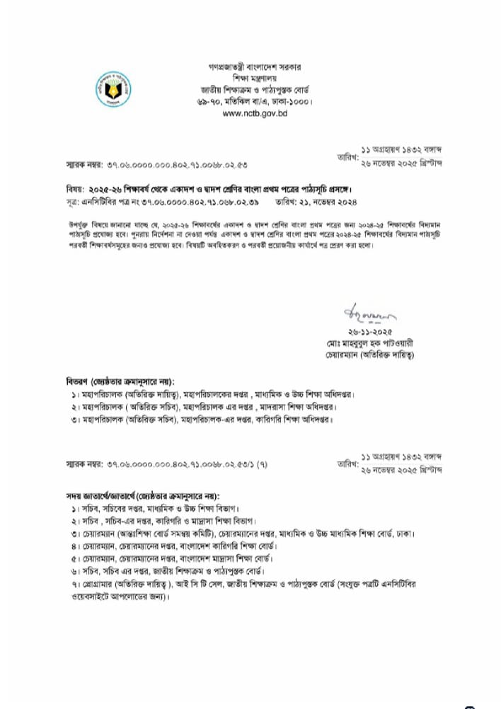 বিজ্ঞপ্তিতে বলা হয়েছে, ২০২৫-২৬ শিক্ষাবর্ষের একাদশ ও দ্বাদশ শ্রেণির বাংলা প্রথম পত্রের জন্য ২০২৪-২৫ শিক্ষাবর্ষ বিদ্যমান পাঠ্যসূচি প্রযোজ্য হবে। পুনরায় নির্দেশনা না দেওয়া পর্যন্ত একাদশ ও দ্বাদশ শ্রেণির বাংলা প্রথম পত্রের ২০২৪-২৫ শিক্ষাবর্ষের বিদ্যমান পাঠ্যসূচি পরবর্তী শিক্ষাবর্ষসমূহের জন্যও প্রযোজ্য হবে।