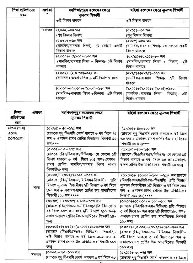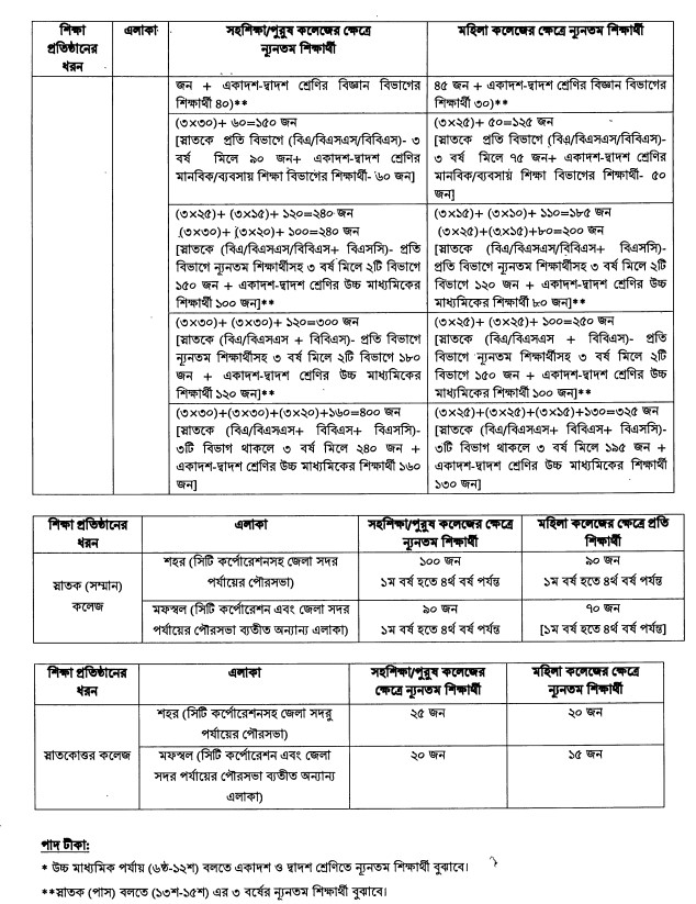 একইভাবে উচ্চ মাধ্যমিক কলেজ, স্নাতক (পাস) কলেজ, স্নাতক (সম্মান) কলেজ এবং স্নাতকোত্তর পর্যায়ের শিক্ষার্থীদের জন্য শহর ও কলেজ ভেদে বিভিন্ন বিভাগত অনুযায়ী নির্দিষ্ট সংখ্যক শিক্ষার্থী থাকার কথা বলা হয়েছে। এ সংক্রান্ত তথ্য দেখুন ছবিতে-