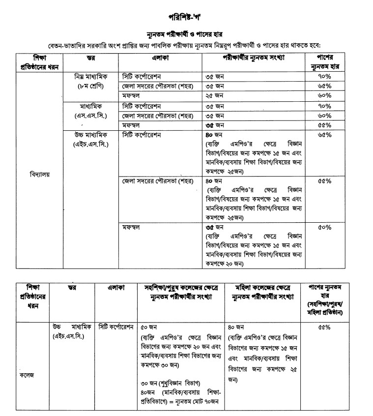 নীতিমালায় বলা হয়েছে, বেতন-ভাতাদির সরকারি অংশ প্রাপ্তির জন্য পাবলিক পরীক্ষায় ন্যূনতম পরীক্ষার্থী ও পাসের হার থাকতে হবে। নিম্ন মাধ্যমিকে সিটি করপোরেশন ও জেলায় ৩৫ জনের মধ্যে ৭০ ও ৬৫ শতাংশ এবং মফস্বলে ২৫ জনের মধ্যে ৬০ শতাংশ পাস করতে হবে। মাধ্যমিক বিদ্যালয়ের জন্য সিটি করপোরেশন ও জেলায় ৩৫ জনের মধ্যে যথাক্রমে ৭০ ও ৬০ শতাংশ এবং মফস্বলে ৫৫ শতাংশ।