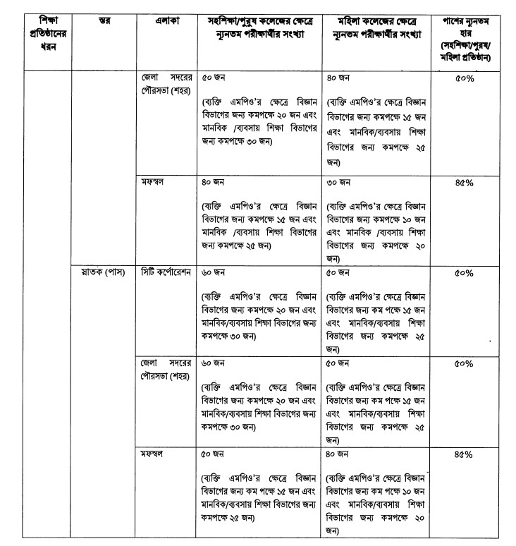 একইভাবে উচ্চ মাধ্যমিক কলেজ, স্নাতক (পাস) কলেজ, স্নাতক (সম্মান) কলেজ এবং স্নাতকোত্তর পর্যায়ের শিক্ষার্থীদের জন্য শহর ও কলেজ ভেদে বিভিন্ন বিভাগত অনুযায়ী নির্দিষ্ট সংখ্যক শিক্ষার্থী থাকার কথা বলা হয়েছে।