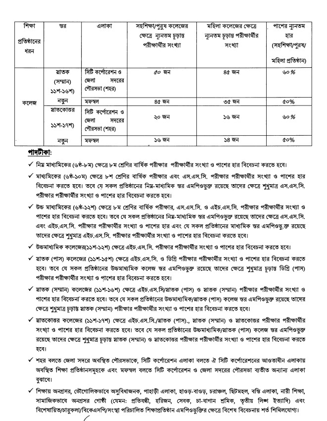 উচ্চ মাধ্যমিক বিদ্যালয়ে সিটি করপোরেশন ও জেলায় ৪০ জনে ৬৫ ও ৫৫ শতাংশ এবং মফস্বলে ৩৫ জনে ৫০ শতাংশ পাস করতে হবে। একইভাবে উচ্চ মাধ্যমিক কলেজ, স্নাতক (পাস) কলেজ, স্নাতক (সম্মান) কলেজ এবং স্নাতকোত্তর পর্যায়ের শিক্ষার্থীদের জন্য শহর ও কলেজ ভেদে বিভিন্ন বিভাগত অনুযায়ী নির্দিষ্ট সংখ্যক পরীক্ষার্থী ও পাসের হার থাকার কথা বলা হয়েছে, যা ৪৫ থেকে ৬০ শতাংশ পর্যন্ত। প্রতিষ্ঠানভেদে পরীক্ষার্থী ও পাসের হার দেখুন ছবিতে-