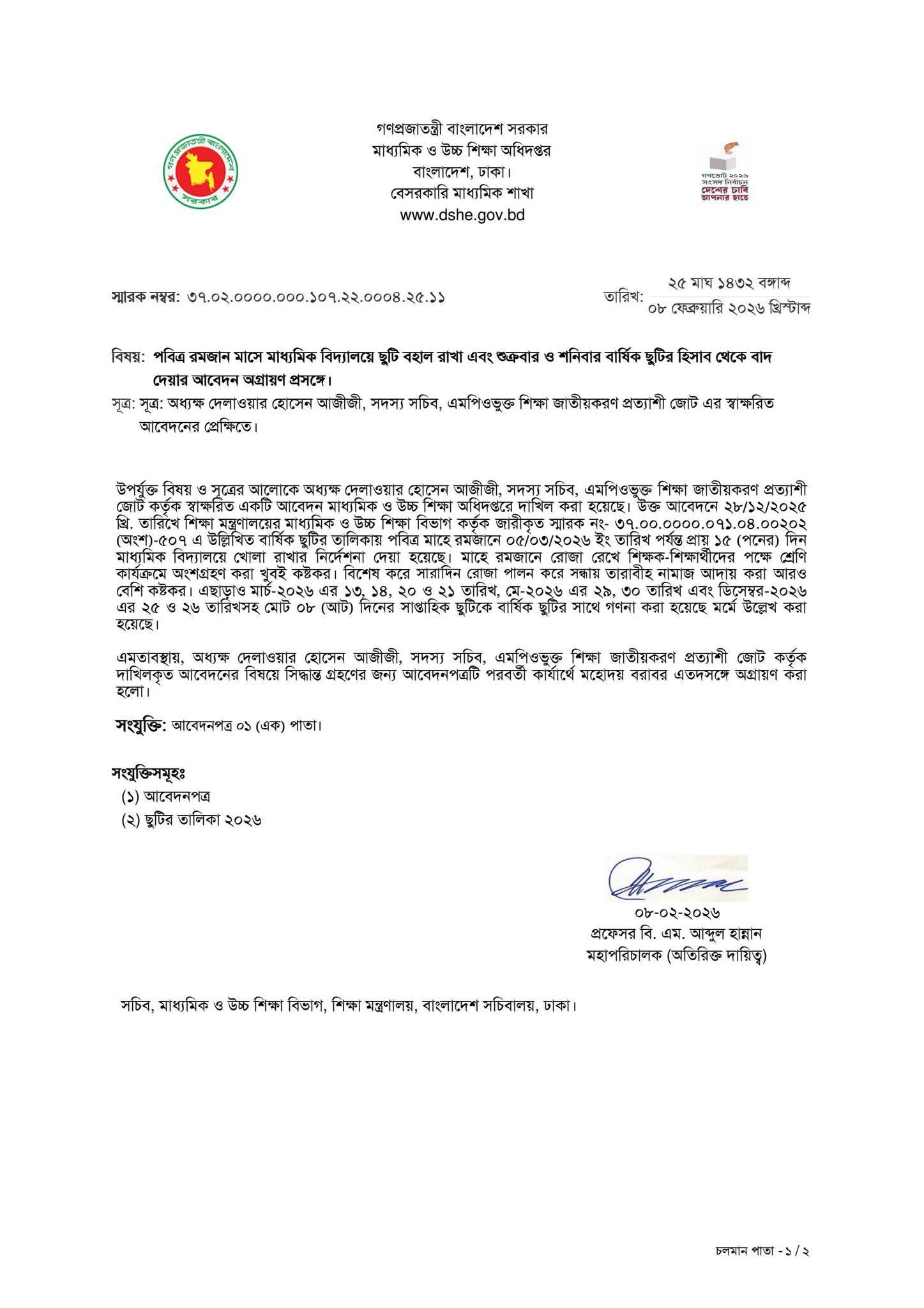 বিজ্ঞপ্তিতে বলা হয়, এমপিওভুক্ত শিক্ষা জাতীয়করণ প্রত্যাশী জোটের সদস্য সচিব অধ্যক্ষ দেলাওয়ার হোসেন আজীজী স্বাক্ষরিত একটি আবেদন মাধ্যমিক ও উচ্চ শিক্ষা অধিদপ্তরে দাখিল করা হয়েছে। আবেদনে গত ২৮ ডিসেম্বর শিক্ষা মন্ত্রণালয়ের মাধ্যমিক ও উচ্চ শিক্ষা বিভাগ কর্তৃক জারীকৃত স্মারক নং- ৩৭.০০.০০০০.০৭১.০৪.০০২০২ (অংশ)-৫০৭ এ উল্লিখিত বার্ষিক ছুটির তালিকায় পবিত্র মাহে রমজানে ৫ মার্চ পর্যন্ত প্রায় ১৫ (পনেরো) দিন মাধ্যমিক বিদ্যালয়ে খোলা রাখার নির্দেশনা দেওয়া হয়েছে।