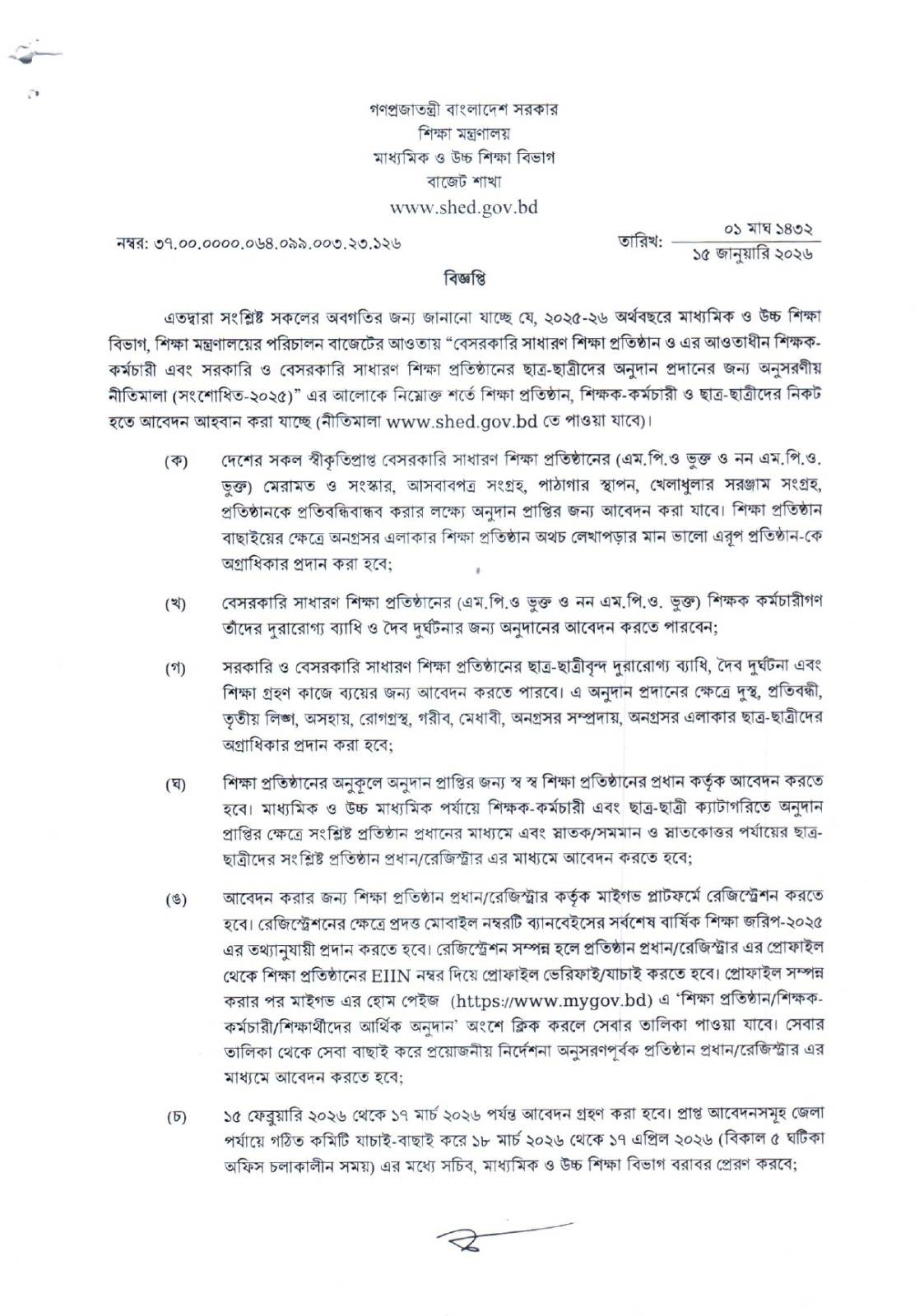 সরকারি সহায়তায় এবার শিক্ষার্থী এবং বেসরকারি শিক্ষক-কর্মচারীরা পাবেন আর্থিক অনুদান। ২০২৫-২৬ অর্থবছরের জন্য মাধ্যমিক ও উচ্চ শিক্ষা বিভাগ অনলাইনের মাধ্যমে আবেদন আহ্বান করেছে। অনুদান পাবার ক্ষেত্রে বিশেষভাবে দুস্থ, প্রতিবন্ধী, তৃতীয় লিঙ্গ, গরীব ও অনগ্রসর সম্প্রদায়ের শিক্ষার্থীদের অগ্রাধিকার দেওয়া হবে।