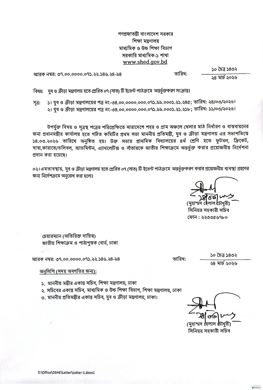 এছাড়াও যুব ও ক্রীড়া মন্ত্রণালয় থেকে পাঠানো সাতটি ইভেন্ট পাঠক্রমে অন্তর্ভুক্তকরণ করার প্রয়োজনীয় ব্যবস্থা নেয়ার জন্য নির্দেশ দেওয়া হয়েছে।