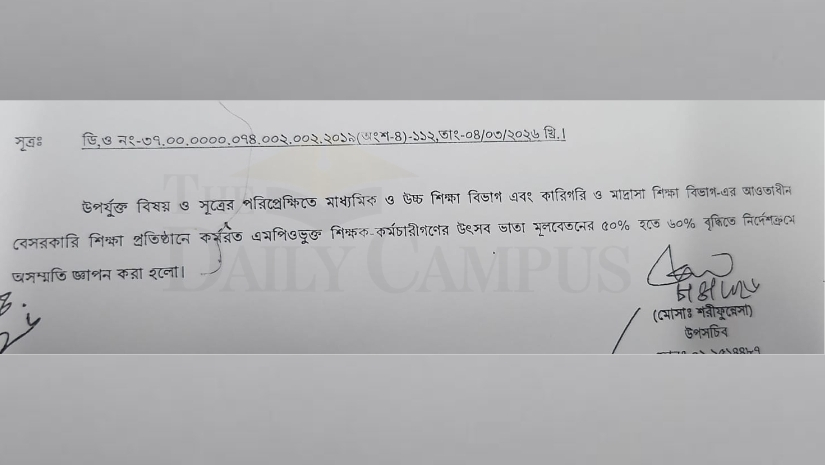 অর্থ মন্ত্রণালয়ের উপসচিব মোসা. শরীফুন্নেসা স্বাক্ষরিত চিঠিতে বলা হয়েছে, ‘মাধ্যমিক ও উচ্চশিক্ষা বিভাগ এবং কারিগরি ও মাদ্রাসা শিক্ষা বিভাগের আওতাধীন এমপিওভুক্ত শিক্ষক-কর্মচারীদের উৎসব ভাতা মূল বেতনের ৫০ শতাংশ থেকে ৬০ শতাংশ বৃদ্ধিতে নির্দেশক্রমে অসম্মতি জ্ঞাপন করা হলো।’