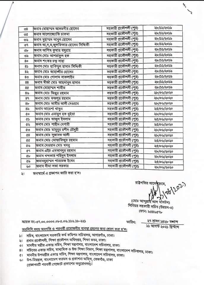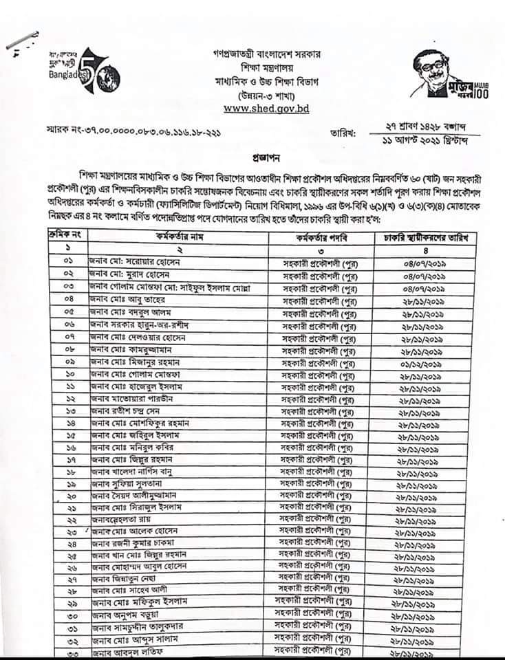 যোগদানের সময় উল্লেখিত শর্ত পূরণ করায় শিক্ষা মন্ত্রণালয়ের মাধ্যমিক ও উচ্চশিক্ষা বিভাগের আওতাধীন শিক্ষা প্রকৌশল অধিদপ্তরের ৬০ জন সহকারী প্রকৌশলির চাকরি স্থায়ী করা হয়েছে।