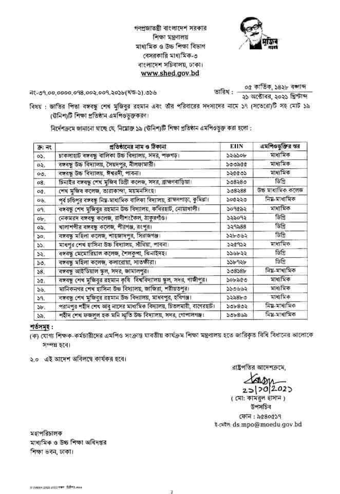 আরও ১৯টি নিম্ন মাধ্যমিক, মাধ্যমিক ও উচ্চমাধ্যমিক পর্যায়ের শিক্ষা প্রতিষ্ঠান এমপিওভুক্ত করা হয়েছে। নতুন এমপিও পাওয়া প্রতিষ্ঠানগুলোর মধ্যে ১৭টিই বঙ্গবন্ধু ও তার পরিবারের সদস্যদের নামে গড়া প্রতিষ্ঠান।