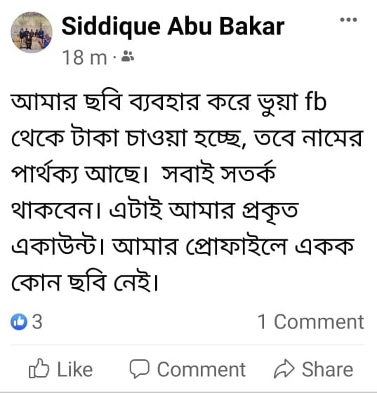 শিক্ষা মন্ত্রণালয়ের মাধ্যমিক ও উচ্চ শিক্ষা বিভাগের সচিব মো. আবু বকর ছিদ্দীকের নামে তৈরি করা ভুয়া ফেসবুক আইডি থেকে টাকা চেয়ে বিভিন্ন জনকে বিভ্রান্ত করার অভিযোগ পাওয়া গেছে।