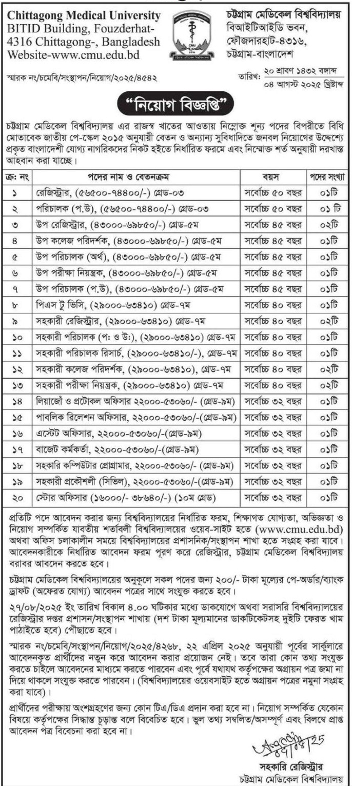 চট্টগ্রাম মেডিকেল বিশ্ববিদ্যালয়ে প্রশাসনিক বিভিন্ন পদে চাকরি, নেবে ২৪ কর্মকর্তা