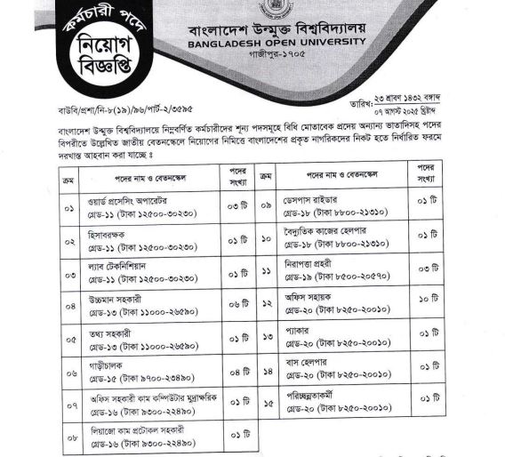 জনবল নিয়োগে বিজ্ঞপ্তি প্রকাশ করেছে বাংলাদেশ উন্মুক্ত বিশ্ববিদ্যালয় (বাউবি)। প্রতিষ্ঠানটি ১১ থেকে ২০তম গ্রেডে ১৫ পদে ৩৬ কর্মী নিয়োগে ৭ আগস্ট প্রকাশ করেছে এ বিজ্ঞপ্তি। আগ্রহী প্রার্থীরা আগামী ৭ সেপ্টেম্বরের মধ্যে সরাসরি-ডাক-কুরিয়ারযোগে আবেদন করতে পারবেন।