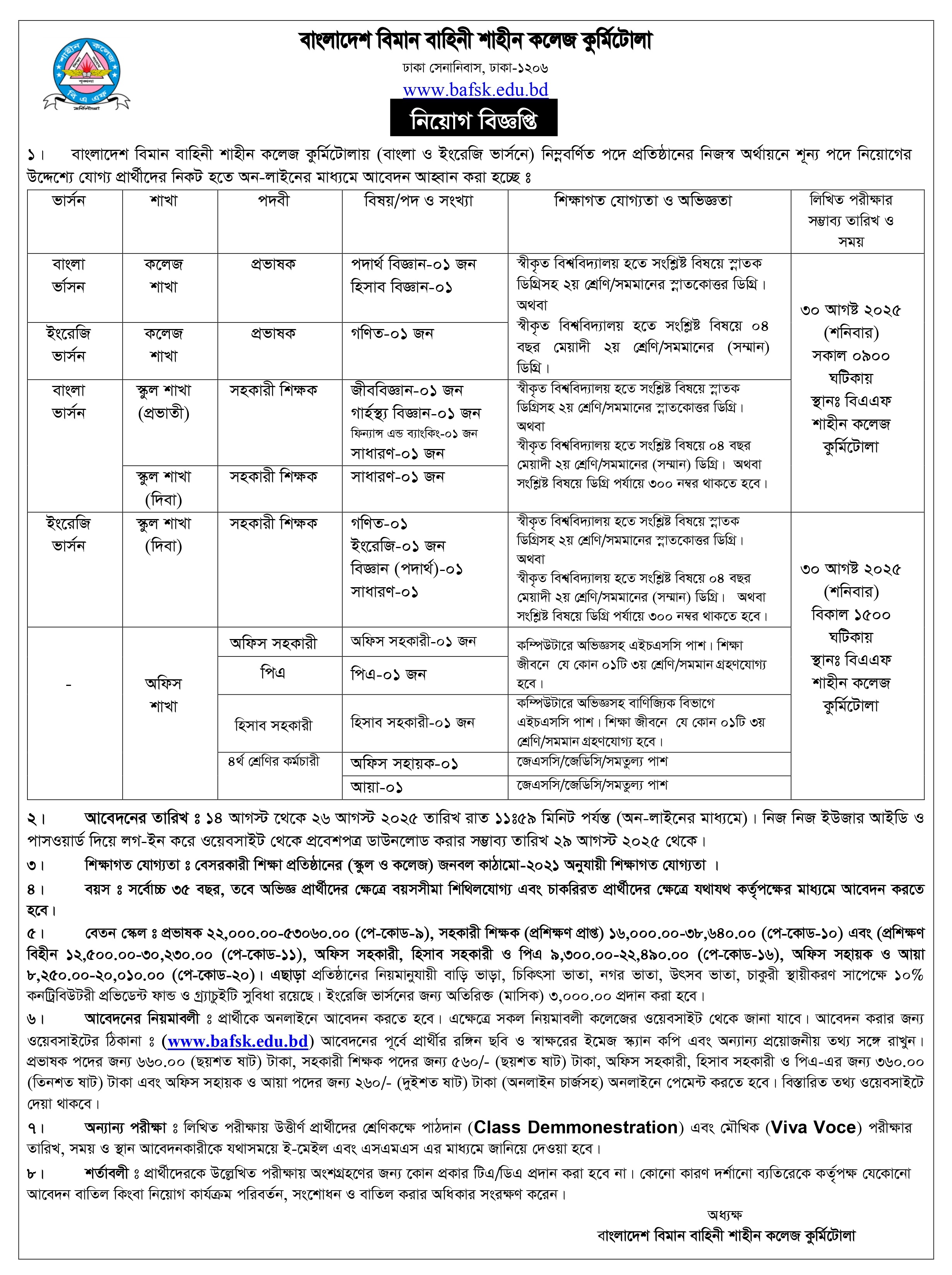 বিএএফ শাহীন কলেজ নেবে শিক্ষক-কর্মচারী, পদ ১৭