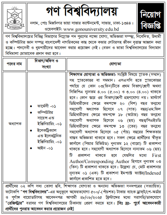 গণ বিশ্ববিদ্যালয়ে চাকরি, আবেদন সরাসরি-ডাকযোগে