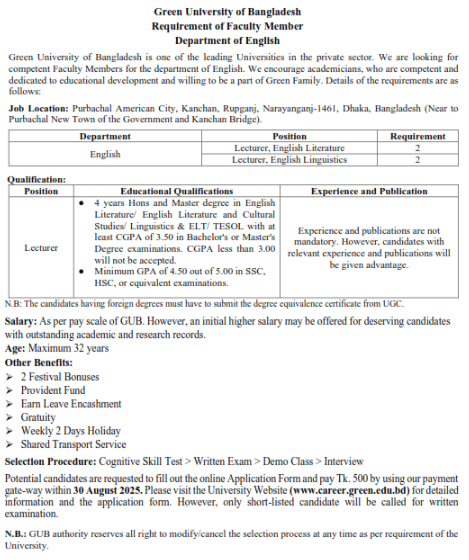 অভিজ্ঞতা ছাড়াই শিক্ষক নিয়োগ দেবে গ্রিন ইউনিভার্সিটি, আবেদন অনলাইনে