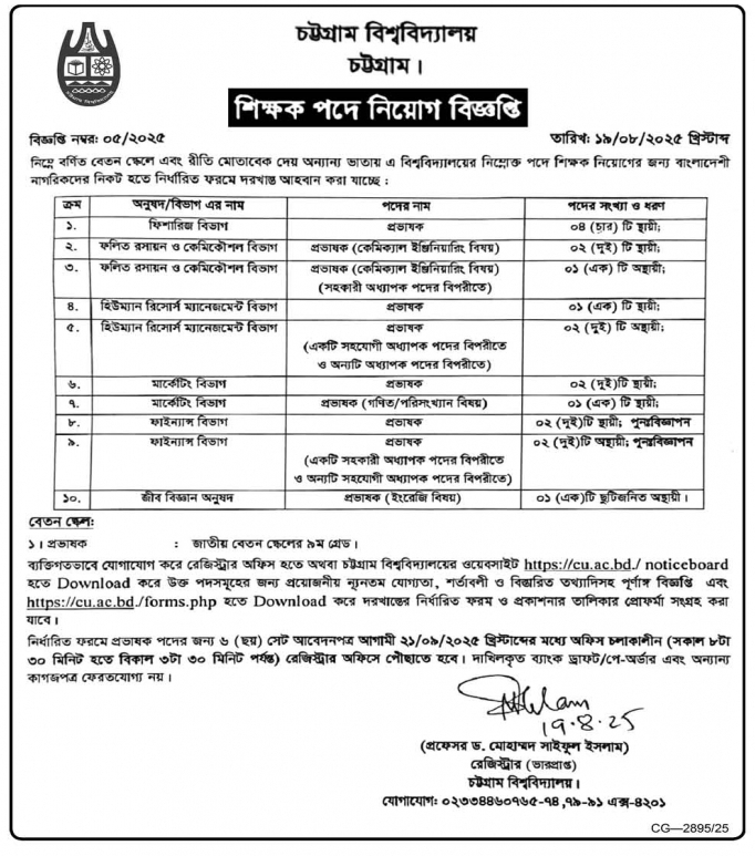 শিক্ষক নিয়োগ দেবে চট্টগ্রাম বিশ্ববিদ্যালয়, পদ ১৮