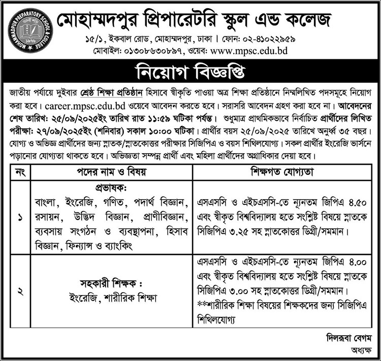 মোহাম্মদপুর প্রিপারেটরি স্কুল অ্যান্ড কলেজে চাকরি, নেবে প্রভাষক-সহকারী শিক্ষক