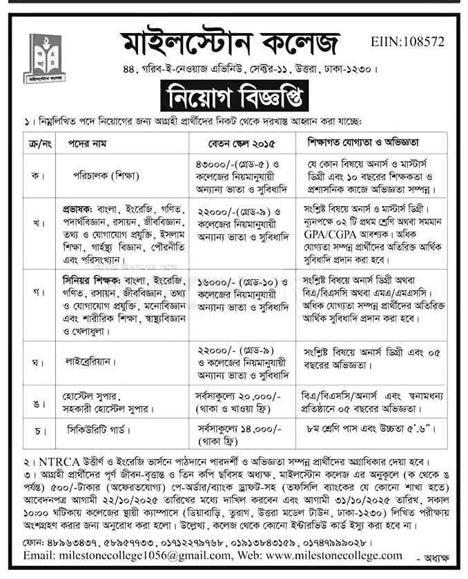 পরিচালক-হোস্টেল সুপারসহ ১৪ বিভাগের শিক্ষক নেবে মাইলস্টোন কলেজ
