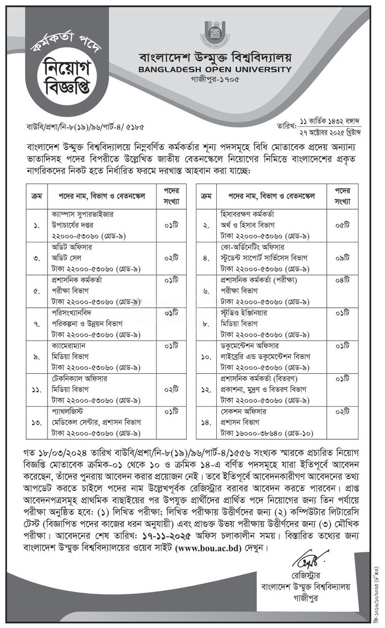 কর্মকর্তা নিয়োগ দেবে উন্মুক্ত বিশ্ববিদ্যালয়, পদ ৩২, আবেদন শেষ ১৭ নভেম্বর