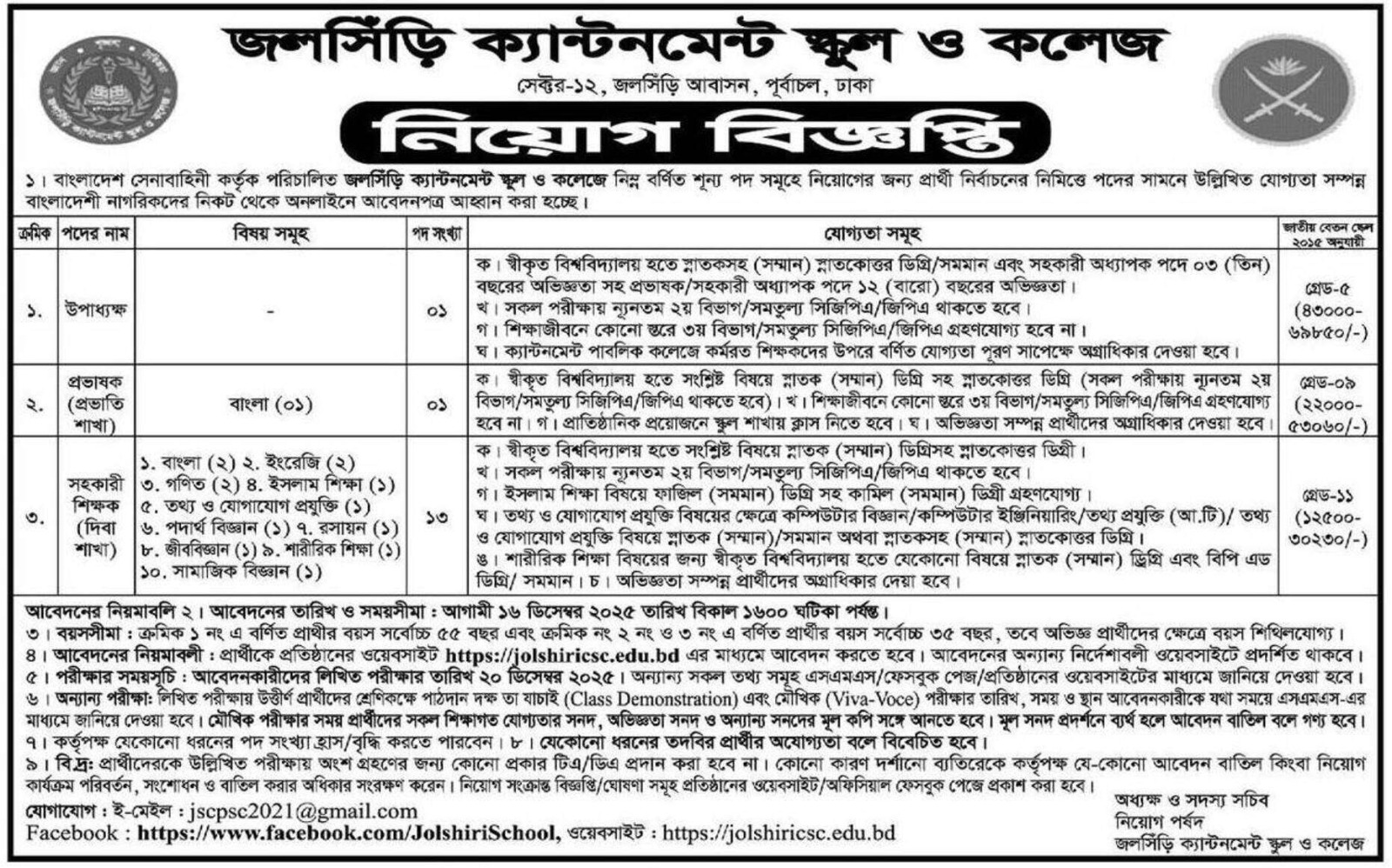 জলসিঁড়ি ক্যান্টনমেন্ট স্কুল ও কলেজে চাকরি, পদ ১৫, আবেদন অনলাইনে