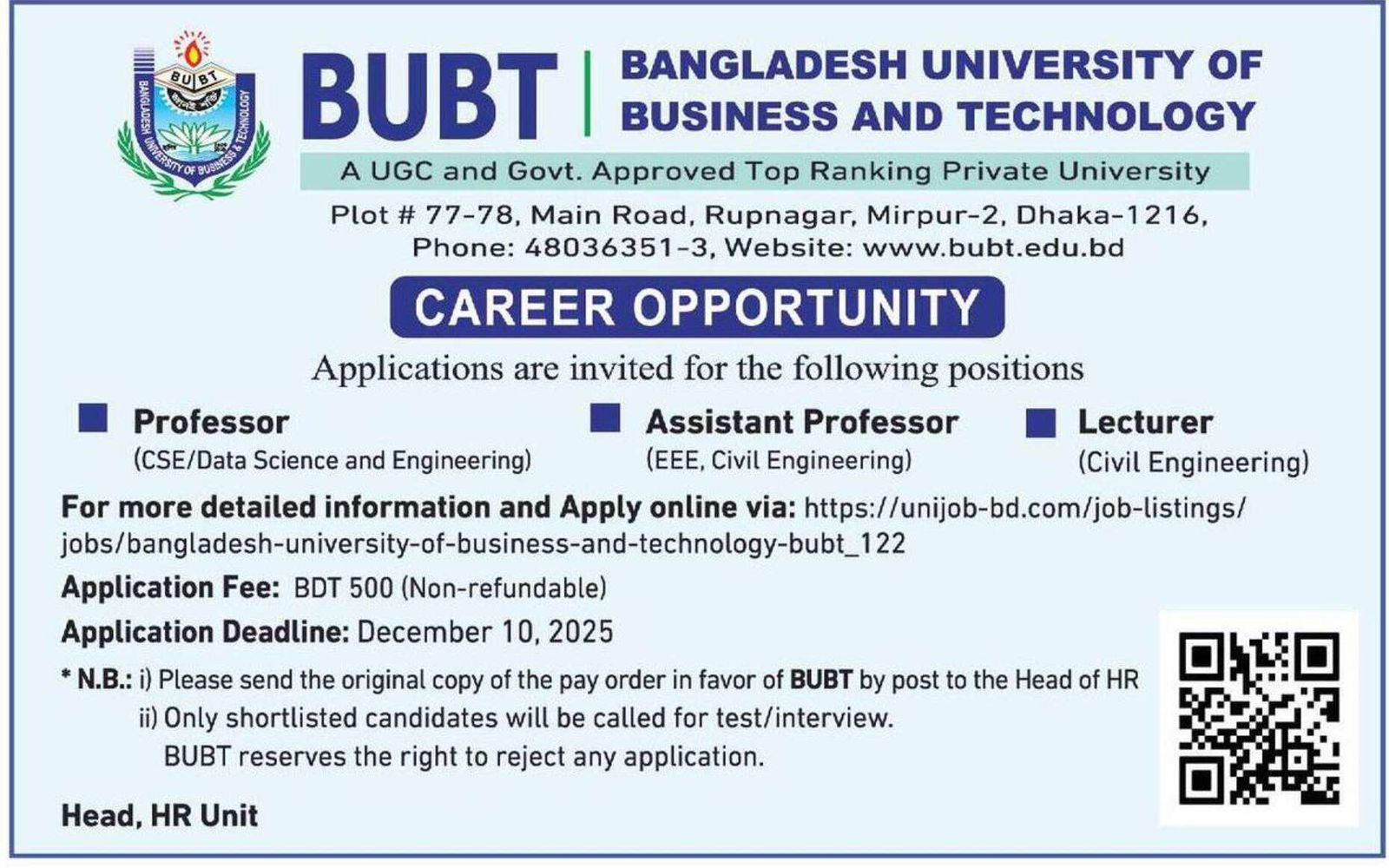 শিক্ষক নিয়োগ দেবে বাংলাদেশ ইউনিভার্সিটি অব বিজনেস অ্যান্ড টেকনোলজি, কর্মস্থল ঢাকা