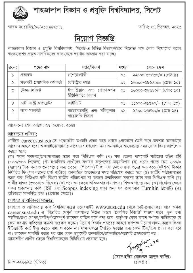 জনবল নিয়োগে বিজ্ঞপ্তি প্রকাশ করেছে শাহজালাল বিজ্ঞান ও প্রযুক্তি বিশ্ববিদ্যালয়। প্রতিষ্ঠানটি বিভিন্ন বিভাগ ও দপ্তরে ৫ পদে ৬ শিক্ষক-কর্মকর্তা-কর্মচারী নিয়োগে ৭ ডিসেম্বর প্রকাশ করেছে এ বিজ্ঞপ্তি। আগ্রহী প্রার্থীরা আগামী ২৭ ডিসেম্বরের মধ্যে অনলাইনে আবেদন করতে পারবেন।