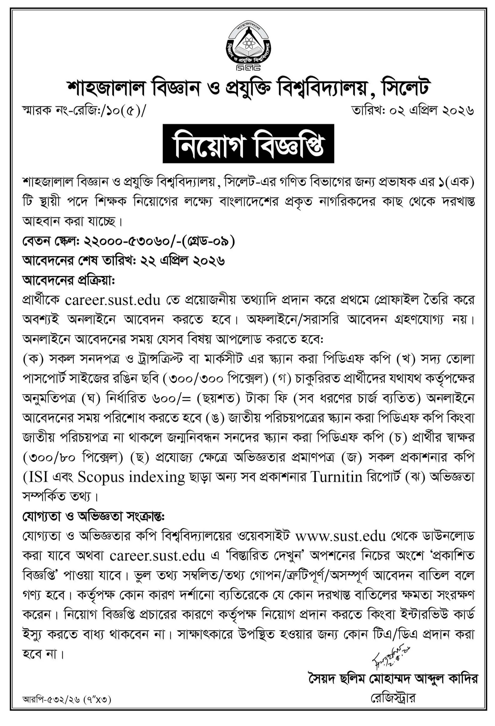 আবেদনের শেষ তারিখ: আগামী ২২ এপ্রিল ২০২৬;