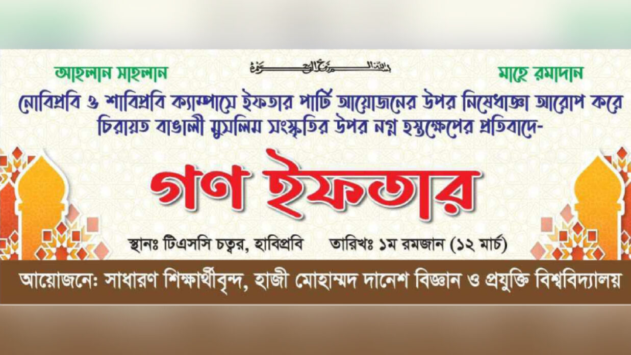 নোয়াখালী বিজ্ঞান ও প্রযুক্তি বিশ্ববিদ্যালয় (নোবিপ্রবি) ও শাহজালাল বিজ্ঞান ও প্রযুক্তি বিশ্ববিদ্যালয় (শাবিপ্রবি) ক্যাম্পাসে ইফতার পার্টি আয়োজনের উপর নিষেধাজ্ঞা আরোপ করে চিরায়ত বাঙালি মুসলিম সংস্কৃতির উপর নগ্ন হস্তক্ষেপের প্রতিবাদে গণ-ইফতারের আয়োজন করেছে হাজী মোহাম্মদ দানেশ বিজ্ঞান ও প্রযুক্তি বিশ্ববিদ্যালয়ের সাধারণ শিক্ষার্থীরা।