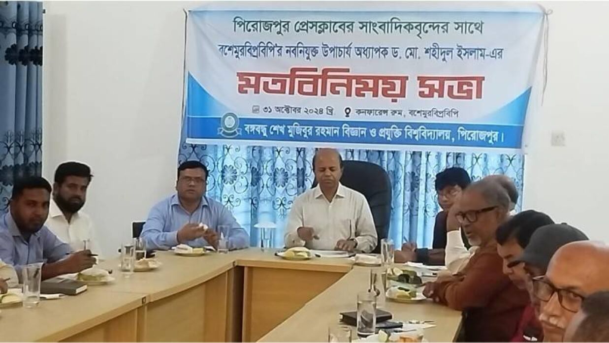 পিরোজপুরের বঙ্গবন্ধু শেখ মুজিবুর রহমান বিজ্ঞান ও প্রযুক্তি বিশ্ববিদ্যালয়ের (বশেমুরবিপ্রবিপি) নবনিযুক্ত উপাচার্য অধ্যাপক ড. মো. শহীদুল ইসলাম পিরোজপুর প্রেসক্লাবের সাংবাদিকবৃন্দের সাথে এক মতবিনিময় সভায় অংশ নিয়েছেন। আজ বৃহস্পতিবার (৩১ অক্টোবর) সকাল ১০টায় বশেমুরবিপ্রবিপির কনফারেন্স রুমে এ মতবিনিময় সভার আয়োজন করা হয়।