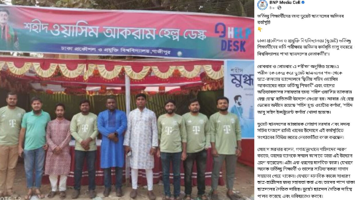 ডুয়েটে গত ১৭ এবং ১৮ ই নভেম্বর ভর্তি পরীক্ষা অনুষ্ঠিত হয়। ভর্তি পরিক্ষায় অংশ নেয়া শিক্ষার্থীদের সহযোগিতার জন্য জুলাই বিপ্লবের শহিদ ওয়াসিম আকরামের নামে শহিদ ওয়াসিম আকরাম হেল্প ডেস্ক এবং শহিদ মীর মুগ্ধ ওয়াটার কর্নার স্থাপন করেন। এই হেল্প ডেস্কে ভর্তি পরীক্ষার দুই দিন ই সাধারণ শিক্ষার্থীরা স্বতঃস্ফূর্ত ভাবে ভর্তিচ্ছু শিক্ষার্থী এবং অভিভাবকদের সহযোগিতা করেন। কিন্তু ১৮ তারিখ রাতে ‘বিএনপি মিডিয়া সেল’ নামে একটা ফেসবুক পেইজ থেকে দাবি করে শহিদ ওয়াসিম আকরাম হেল্প ডেস্কটি ছাত্রদলের নেতাকর্মীরা পরিচালনা করেছেন।