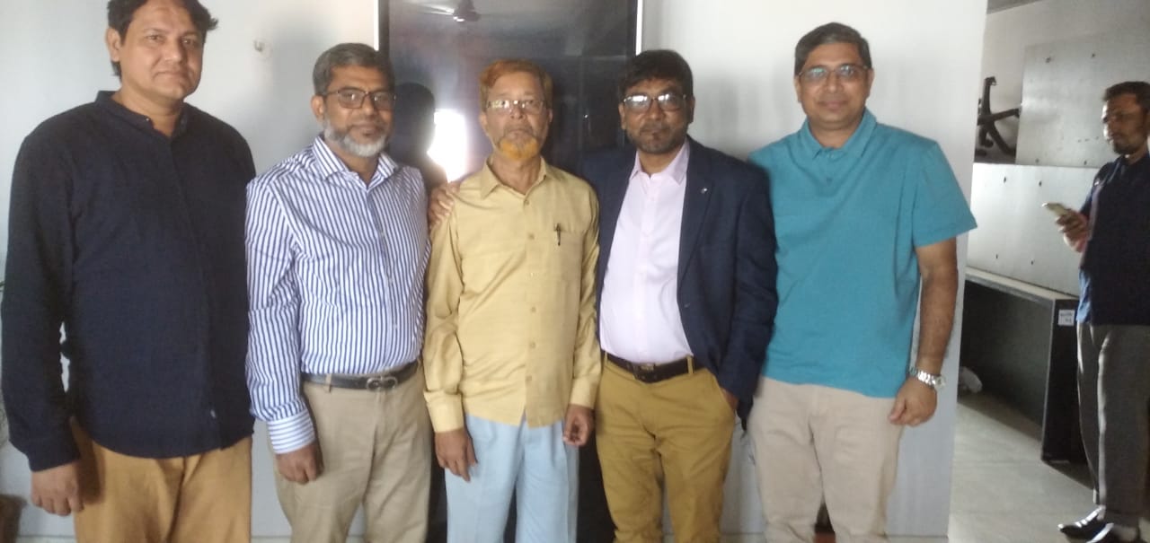 বিশ্ববিদ্যালয় অধ্যাপকদের নিয়ে মন্ত্রণালয়ে বিএনপি নেতা মীর শাহে আলম (সর্ব ডানে)। পাশে নওগাঁ বিশ্ববিদ্যালয়ের উপাচার্য অধ্যাপক হাছানাত,