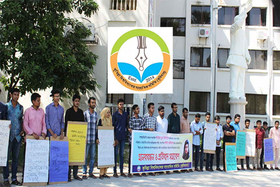 বঙ্গবন্ধু শেখ মুজিবুর রহমান বিজ্ঞান ও প্রযুক্তি বিশ্ববিদ্যালয়ের শিক্ষার্থী ও দ্যা ডেইলি ক্যাম্পাসের ক্যাম্পাস প্রতিনিধি ফাতিমা তুজ জিনিয়ার বিরুদ্ধে সাময়িক বহিষ্কারের নাটক সাজিয়ে হয়রানি এবং আলোকিত বাংলাদেশের প্রতিনিধি শামস জেবিনের উপর ভিসি বাহিনীর হামলার প্রতিবাদে মানববন্ধন ও প্রতিবাদ সমাবেশ করেছে কুমিল্লা বিশ্ববিদ্যালয়ে কর্মরত সাংবাদিকদের সংগঠন ‘কুমিল্লা বিশ্ববিদ্যালয় সাংবাদিক সমিতি (কুবিসাস)’। বৃহস্পতিবার দুপুর ১টায় বিশ্ববিদ্যালয়ের বঙ্গবন্ধু ভাস্কর্যের পাদদেশে এ প্রতিবাদ সমাবেশ অনুষ্ঠিত হয়।